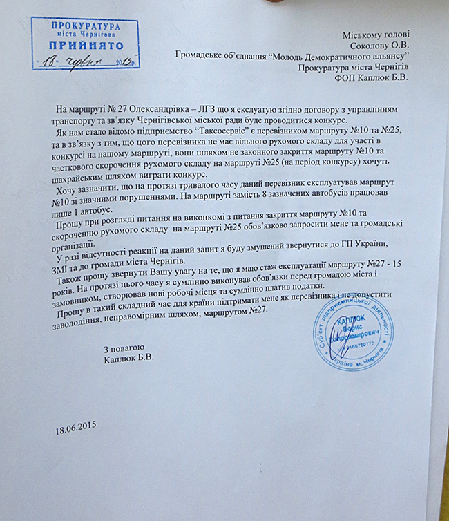 Перевозчики уже обратились и к городскому голове, и в прокуратуру. Но, как говорится, конкурс, есть конкурс. А вот на самом деле у ФОП «Каплюк Б.В» шансов действительно мало! Это если город закроет 10-й маршрут, и «Таксосервис» перебросит автобусы на маршрут №27. Конкурсный комитет просто обязан будет проголосовать за «Таксосервис».