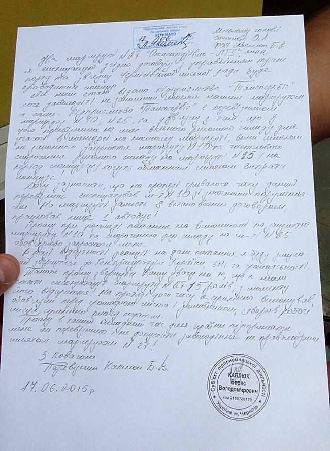 Утром 18 июня, только на сайте написали о том, что городским советом объявлен конкурс на автобусный маршрут №27, как почти сразу – звонок от владельца маршрута Бориса Каплюка. Он хочет встретиться, поговорить – нужна объективная оценка ситуации журналистами.