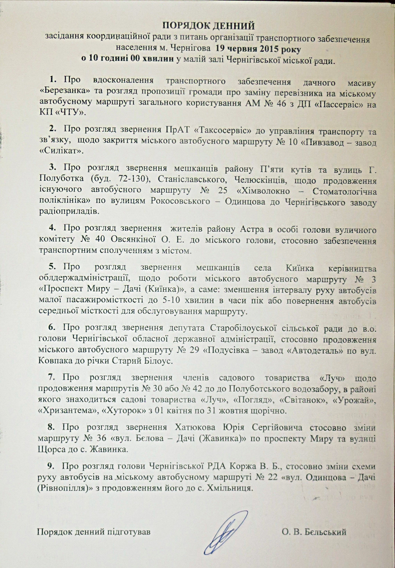 К «специальным» вопросам, отвлекающим внимание от основного, но также вынесенных на координационный совет с «дальним прицелом», можно назвать, например, вопрос под номером один. Это вопрос «Про вдосконалення транспортного забезпечення дачного масиву «Березанка» та розгляд пропозиції громади про заміну перевізника на міському автобусному маршруті загального користування АМ № 46 з ДП «Пассервіс» на КП «ЧТУ».