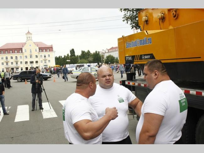 А потом мужчины пошли на мировой рекорд. Впрягшись, они сдвинули с места и протянули более 10 метров сразу два транспортных средства – тот самый автокран и «КамАЗ» с полной бетономешалкой. Общий вес составил 45 тонн!