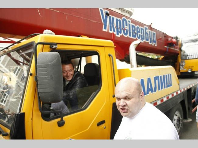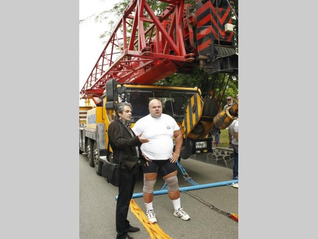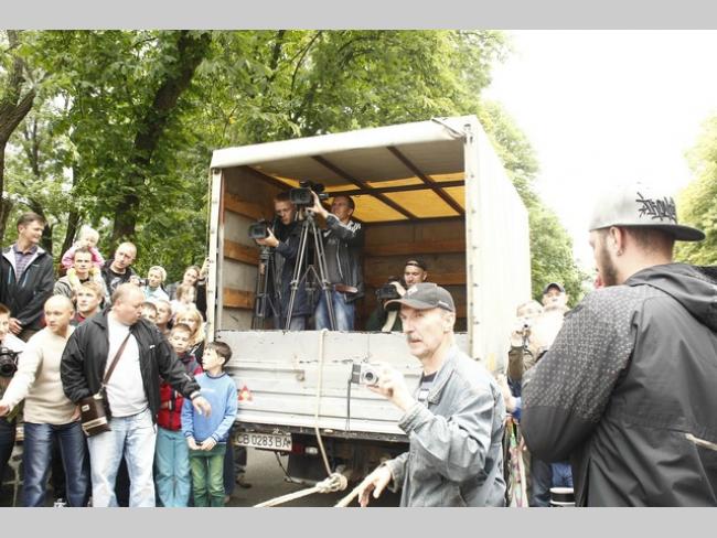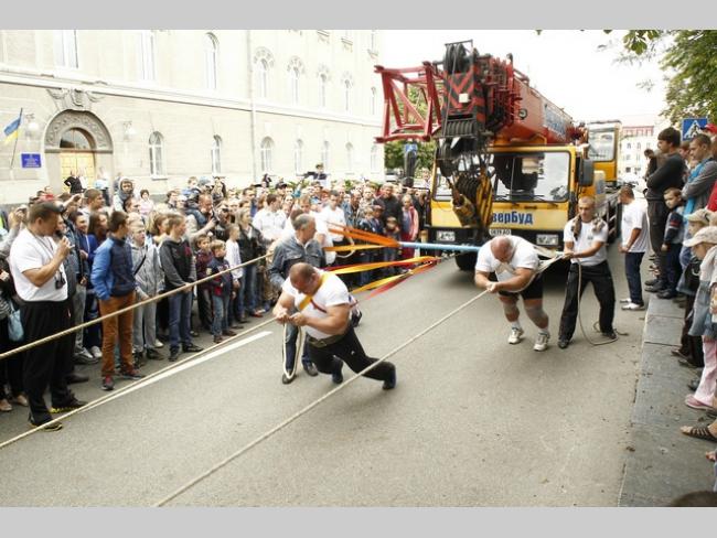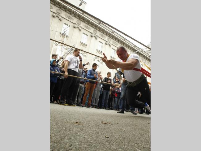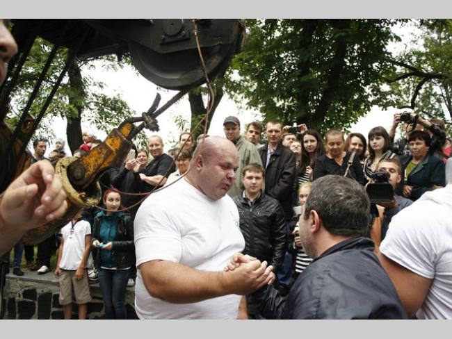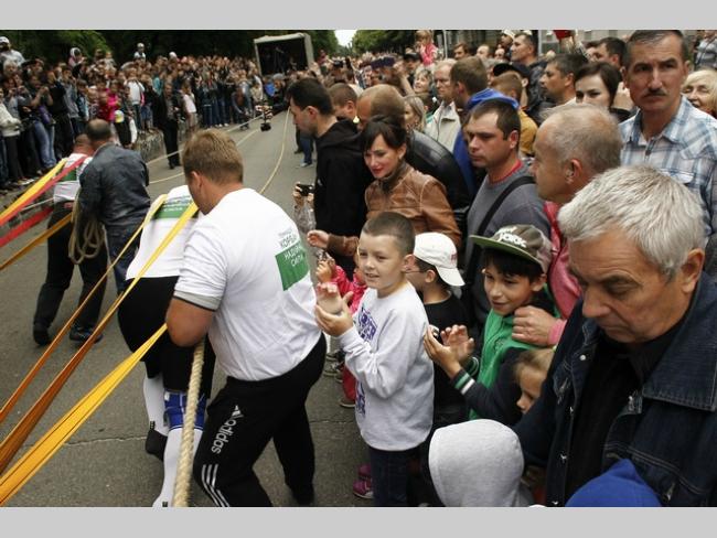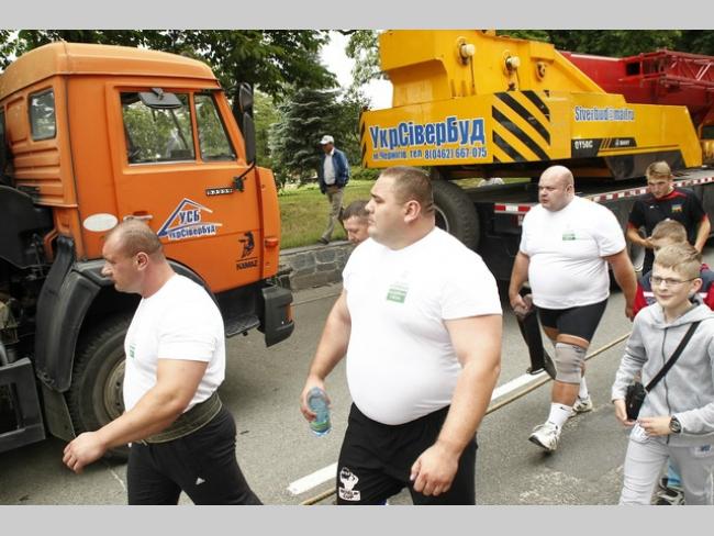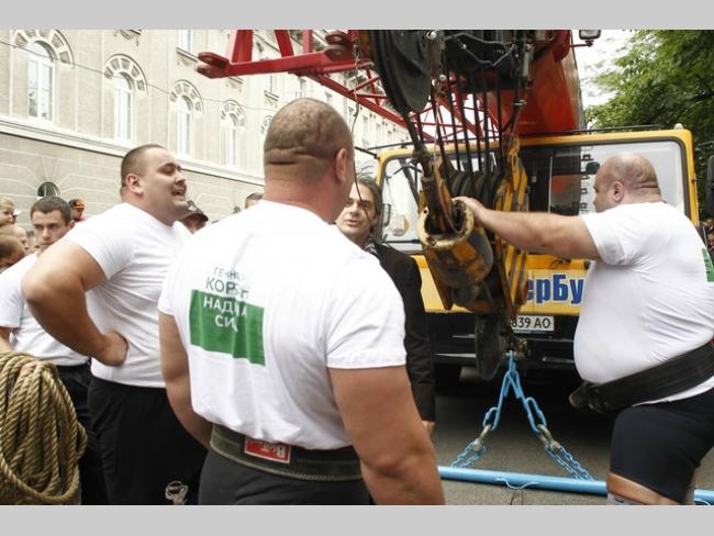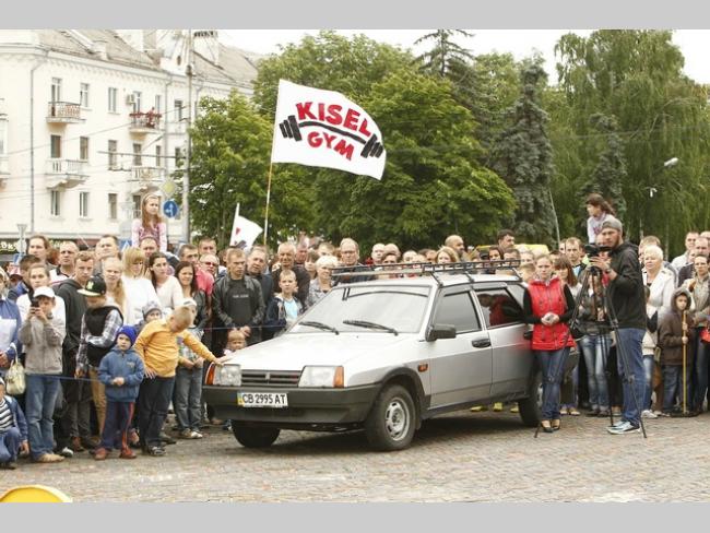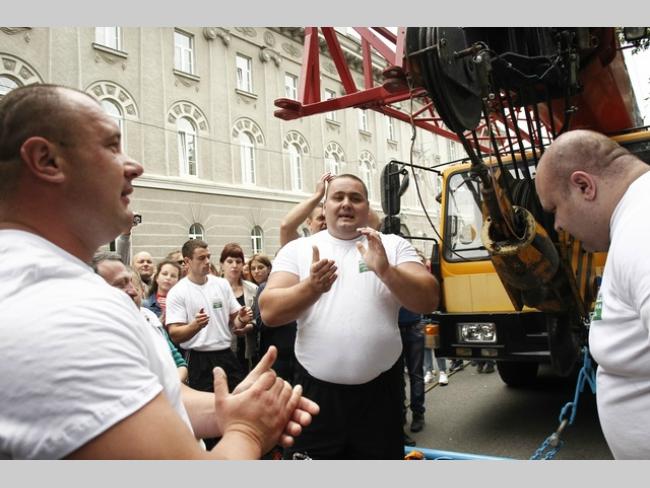 Сначала они, в качестве «разминки» протащили на рекордное расстояние автокран, установив тем самым рекорд Украины, о чем после проведения замеров объявил официальный представитель украинской книги рекордов.