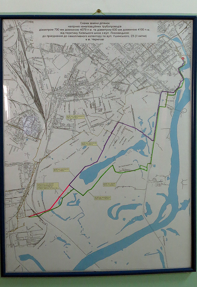 Что же касается количества аварий на канализационном коллекторе, то после введения в эксплуатацию части второй «нитки» коллектора, количество аварий существенно сократилось. Сегодня на повестке дня завершение строительства всего коллектора. На днях начнется его достройка. И хотя средства из госбюджета еще не поступили, КП «Чернигивводокнал» начинает финансирование проекта за 5 млн. грн, выделенных из городского бюджета. Работы будет проводить строительная компания «УкрСиверБуд», которая стала победителем на проведенных торгах. Александр Шкинь надеется, что, несмотря на отставку министра экологии Игоря Шевченко в правительстве не забудут об обещанном Чернигову финансировании строительства объекта, обеспечивающего экологическую безопасность воды в реке Десна. На предприятии надеются, что в этом году наконец-то смогут поставить точку в десятилетней эпопее со строительством. Тем более, что осталось достроить всего ничего – 1254 м коллектора диаметром 800 мм (на фото - красным цветом).