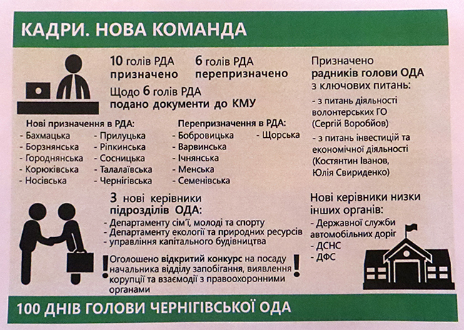 За сто дней также были назначены три советника главы Черниговской ОГА. Сергей Воробьев – по вопросам деятельности волонтерских центров, Константин Иванов – директор Черниговской ТПП – по вопросам экономической деятельности и инвестиций. Также советником по этим же вопросам была назначена Юлия Свириденко, хотя это назначение состоялось с «дальним прицелом» – возглавить департамент экономики Черниговской ОГА.