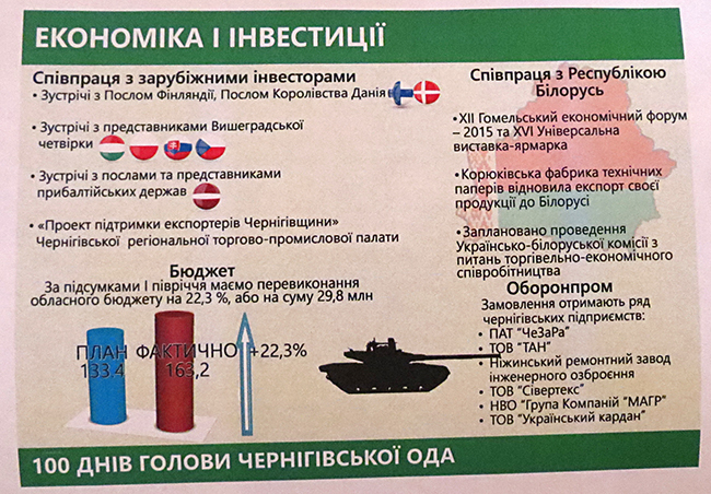 Совместно с Черниговской региональной торгово-промышленной палатой начат проект реальной поддержки экспортеров на 5 лет. Продолжается сотрудничество с Республикой Беларусь. На днях Корюковская фабрика технических бумаг смогла возобновить экспорт своей продукции в Беларусь, а на конец месяца запланировано проведение украинско-белорусской комиссии по вопросам торгово-экономического сотрудничества.