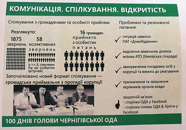 В принципе, о том, что было сделано за сто дней работы – написано на слайде, который представляли во время доклада. Дополнительно хотелось бы сказать о том, что, по словам Кулича, он постоянно старается выработать ровные отношения и с общественными организациями, и с прессой. «В работе меня интересуют не цифры, написанные на бумаге, а решение конкретных проблем, с которыми ко мне обращались. За каждым таким обращением стоит человек, и мы стараемся решать все вопросы, по сути», – прокомментировал ситуацию Валерий Кулич.