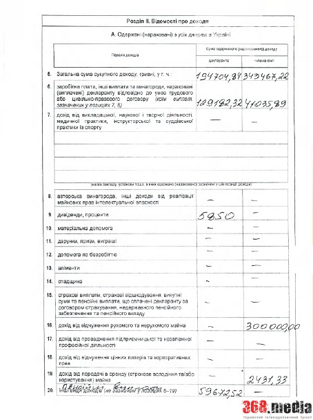 Доход чиновника за весь 2014 год составил 194 тыс. гривен, из которых 129 тыс. гривен пришлось на его зарплату. Остальное он получил в качестве пенсии. Его супруга заработала всего 41 тыс. гривен, а еще 300 тыс. гривен получила от отчуждения имущества.