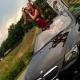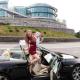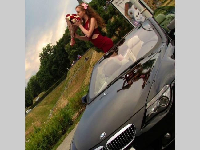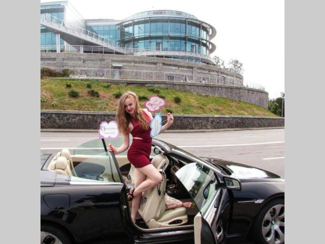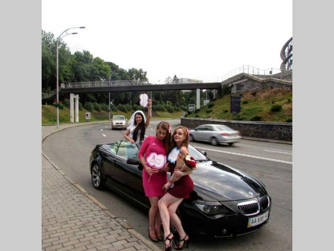 Красивая брюнетка в коротенькой фате и ее подружки позируют с цветами и шампанским на фоне шикарного кабриолета BMW.