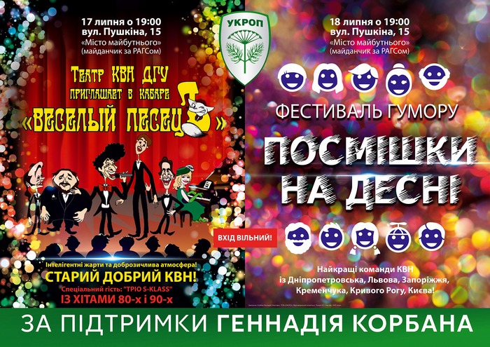 В неділю 19 липня о 19 годині вечора в Чернігові за підтримки кандидата у народні депутати Геннадія Корбана відкриється Фестиваль гумору "Посмішки на Десні". Його учасники - кращі КВН-команди України - зі Львова, Чернігова, Києва, Кременчука, Дніпропетровська та Кривого Рогу.
