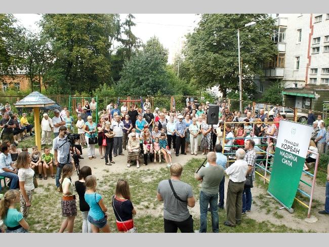 ПЕРЕДВИБОРНА АГІТАЦІЯ Сотні людей щоразу приходять поговорити з кандидатом в народні депутати України Геннадієм Корбаном. Не стала винятком і зустріч у дворі по вул. Героїв Чорнобиля, 1, де невеличкий огорожений парканом дитячий майданчик був забитий людьми так, що ніде і яблоку впасти. За відсутністю вільних місць на лавочках - люди займали навіть дитячі гойдалки та вкопані величезні гумові автомобільні шини.