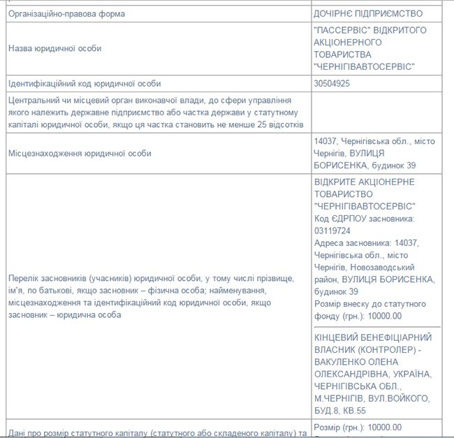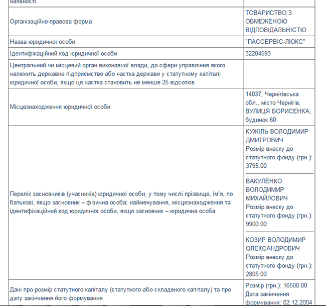 Василий Пась – исполнительный директор Черниговской областной ячейки ВОО «Всеукраинская ассоциация автомобильных перевозчиков». На сайте организации видим, что в Черниговской области ее возглавляет Владимир Козырь, который также совместно с Владимиром Вакуленко является основателем ООО «Пассервис-Люкс», которое расположено по ул. Борисенко, 60. При этом, как мы уже сказали, собственником ДП «Пассервис» является Елена Вакуленко.