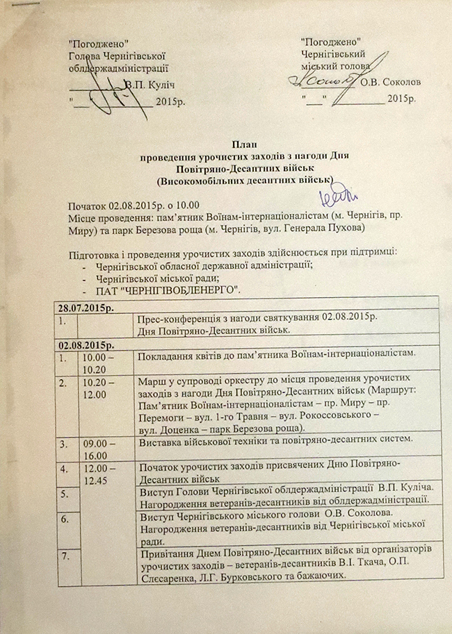Сделать в Чернигове день ВДВ 2 августа – общегородским праздником, предложили ветераны этого рода войск, проживающие в регионе. Идею поддержали как глава Черниговской ОГА Валерий Кулич, так и Черниговский городской голова Александр Соколов.