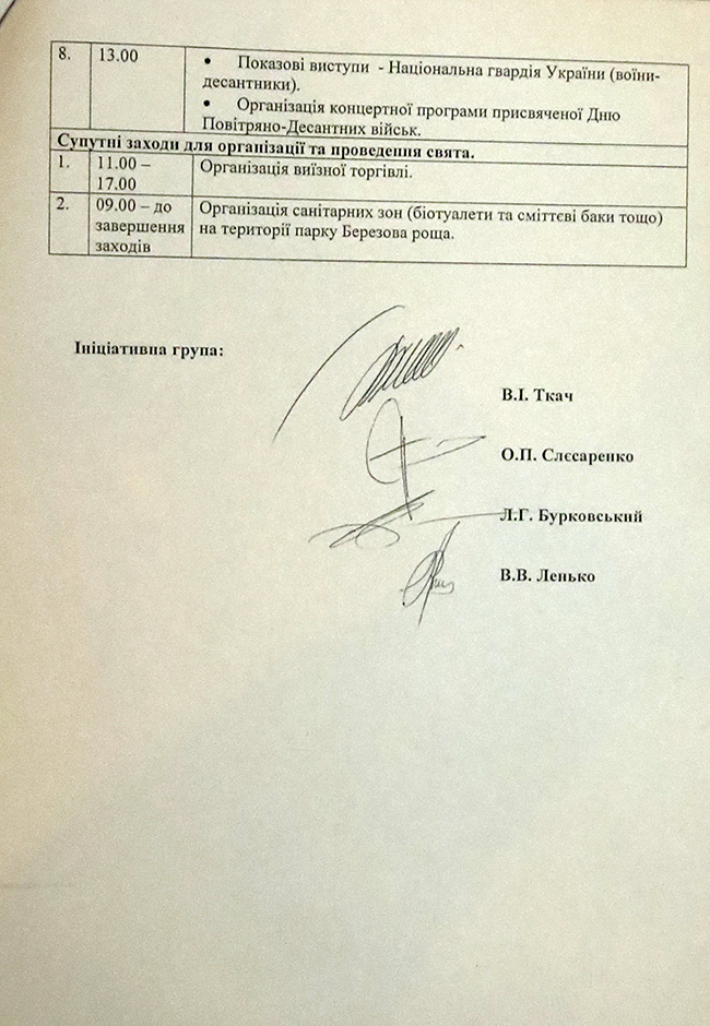 – Инициативная группа ветеранов ВДВ, воинов-афганцев, участников АТО и других ветеранских организаций подняли перед областной администрацией вопрос достойного и организованного проведения праздника – дня ВДВ в Чернигове. Это необходимо в первую очередь для того, чтобы не угасал дух патриотизма, желания служить и защищать свой дом, свою семью, соседей, пожилых и немощных, тех, кто не может себя защитить самостоятельно и в целом – свой край и государство Украина. Празднование 2 августа дня ВДВ, элиты Вооруженных сил – это уникальный повод для того, чтобы оказать почет и уважение всего общества ветеранам, которые служили и воевали раньше как в ВДВ, так и в других родах и видах войск, молодым ветеранам, которые только вернулись из АТО и воевали, как в ВДВ, так и в других частях. Оказать почет и уважение действующим военнослужащим, которые и служат, и воюют в настоящее время. Чтобы они знали, что их воинский и боевой подвиг есть ненапрасным.