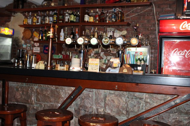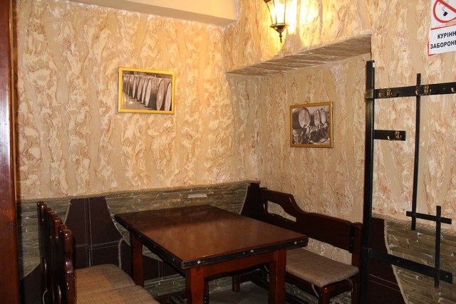 Біля вивіски закладу – жодного згадування про дитяче кафе-морозиво. Прямую вниз по сходах – неяскраве світло, барна стійка з алкогольними напоями, меблі з дерева. Інтер’єр характерний для пабу, і жодного натяку на дитяче кафе.