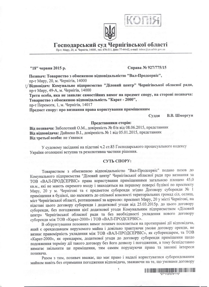 Таким чином рішенням суду по справі № 927/775/15 від 18.06.2015 р. позовну заяву суборендаря було задоволено. Рішення набуло законної сили 06.07.2015 р. ТОВ «Вал-Продсервіс» через суд домоглось залишити за собою право користування приміщенням по укладеним змінам до договору суборенди без погодження їх з комунальним підприємством. А КП «Діловий центр» в свою чергу мусить ще відшкодувати судовий збір у розмірі 1 218,00 грн, який сплатив суборендар.