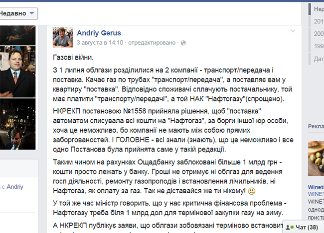 В качестве экспертного мнения по сложившейся ситуации мы хотели бы привести комментарий на странице Фейсбук бывшего член НКРЭКУ Андрея Геруса. В своем посте он доходчиво рассказывает о том, что происходит в газовой сфере Украины и называет все происходящее «Газовыми войнами».