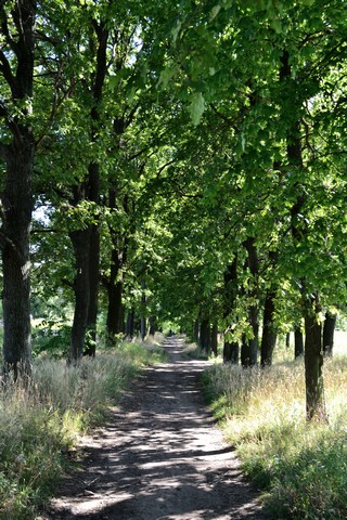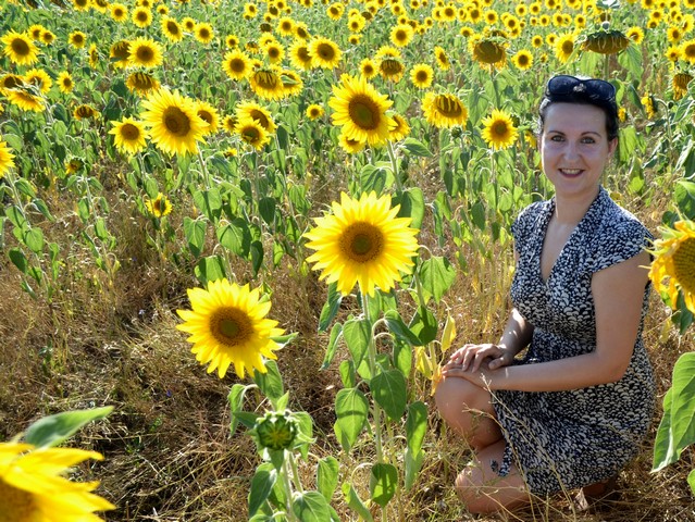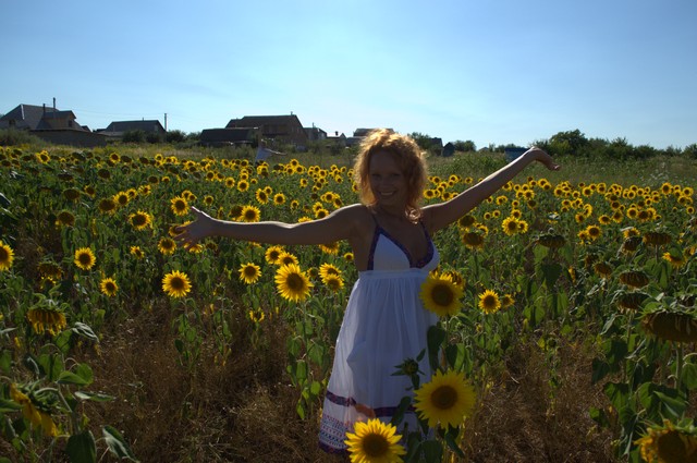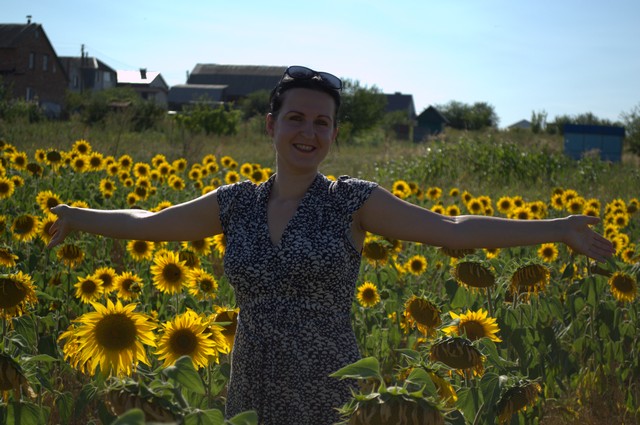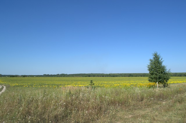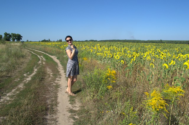 Тенистая дубовая аллея, почти как в английских фильмах про аристократов привела нас к частному сектору, за которым обнаружилось огромное поле с подсолнухами.