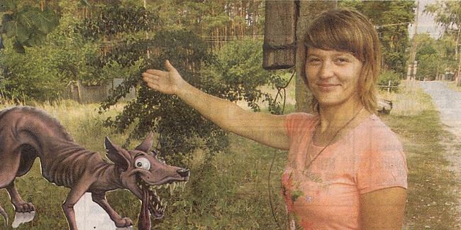 — Було це під вечір, годині о п'ятій, — розказує Ольга Борисівна. — Закривала огірки. Стала виносити воду, щоб вилити на гній. У мене за городом саморослий ліс. Поряд — гній, сінник. Тільки до сінника з водою дійшла, щось як стрибнуло. Спочатку я подумала, що то здоровий рудий кіт. Брудно-рижого кольору. Я з переляку і відро кинула. Вила схопила. Тварина, як спішила під сінник, повернулася до мене боком. Тоді я й роздивилася, що то ні кіт, ні лисиця. Вушка маленькі, морда видовжена, задні лапи довші, ніж передні. На передні тварина майже не опиралася. Кігтів не бачила. Хвіст великий, облізлий, тільки на кінці китиця. Розміром десь по коліна. Звуку ніякого не подало. Саме якесь перелякане, як і я.