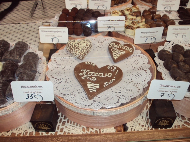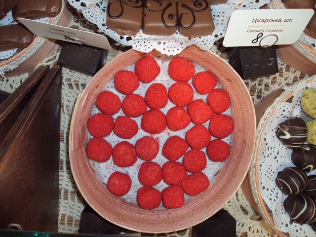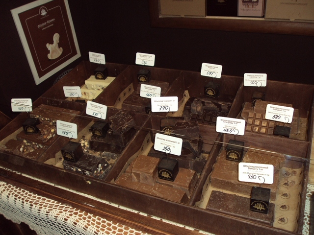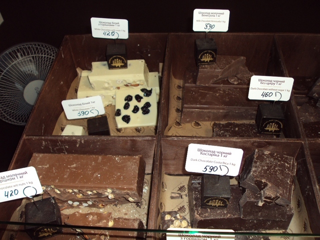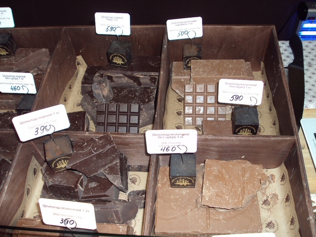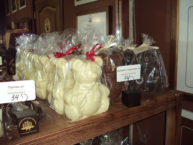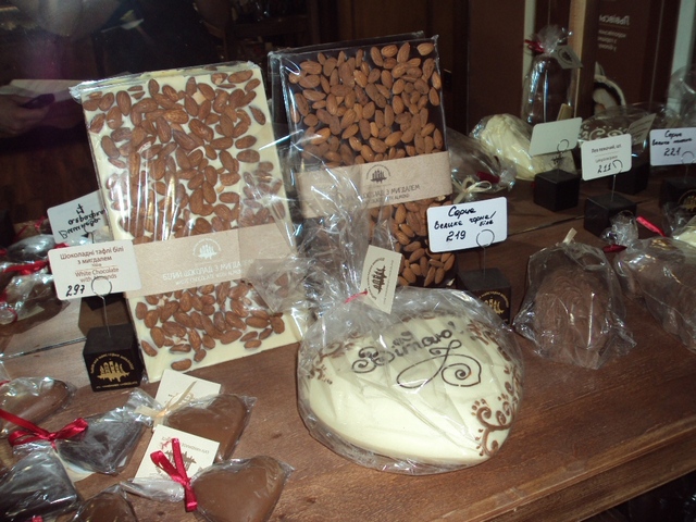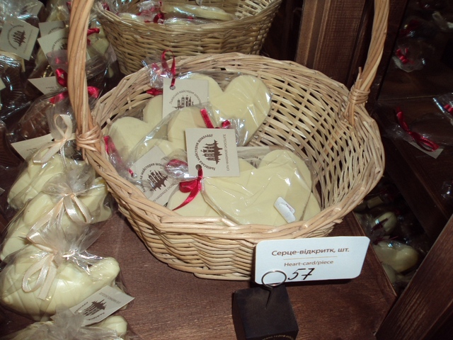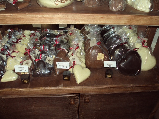 Найдешевший - це цукерка з бізе, з мигдалем або журавлиною, яка коштує чотири гривні. А найдорожчий виріб - це шоколадне серце вагою у 2 кілограми. Якщо брати не виробом, а просто шоколадом, то найдорожчий шоколад в кав'ярні - ваговий. І коштує він - 730 гривень за кілограм.