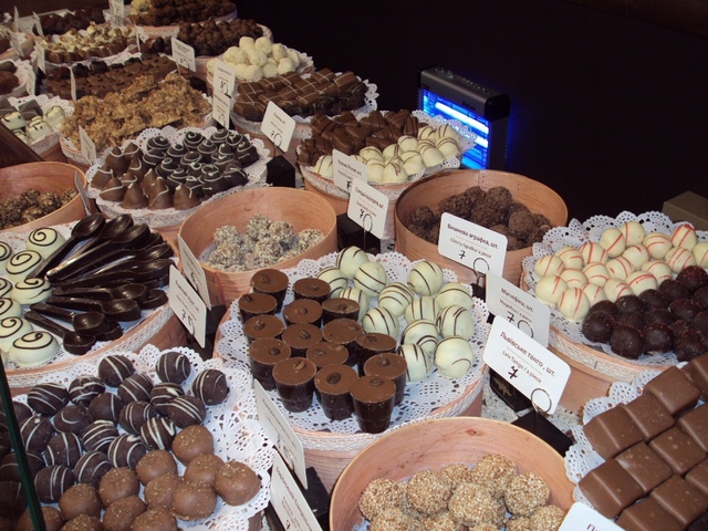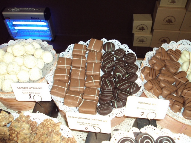 Найбільш незвичайна цукерка має назву "Веселі Драчки", виготовлені з білого та чорного шоколаду з м'ятною начинкою. Також окрім класичних шоколадок з родзинками або горішками у нас є незвичайні поєднання - чорний шоколад з духмяним перцем та перцем чилі, чорний з вишнею, чорний з м'ятою, чорний з сіллю, молочний з корицею, з бадьяном, кавою, кокосом, карамеллю, білий з маком та вишнею. Є цукерки з чорносливом та курагою, горіхові та кремові цукерки.