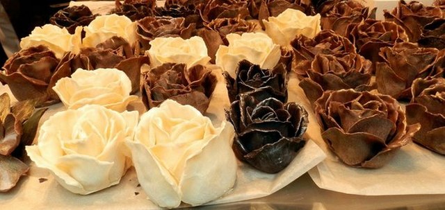Серед нашого асортименту цікавинок є шоколадна троянда, пелюсточки якої шоколатьє заливають вручну на живі пелюстки троянди, а потім формують в одну квітку. Виходить дуже гарно. На шоколадних пелюстках є ледь помітні відбитки від справжньої пелюстки.