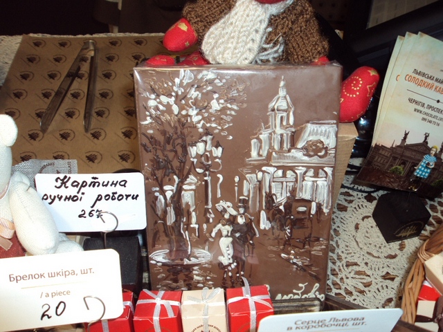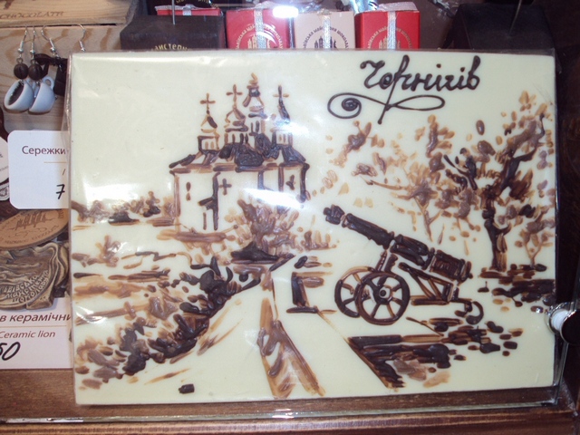 Також ми маємо картини, написані шоколадом. Зараз у наявності є шоколадне зображення променаду закоханої пари та зображення нашого рідного Чернігівського Валу.
