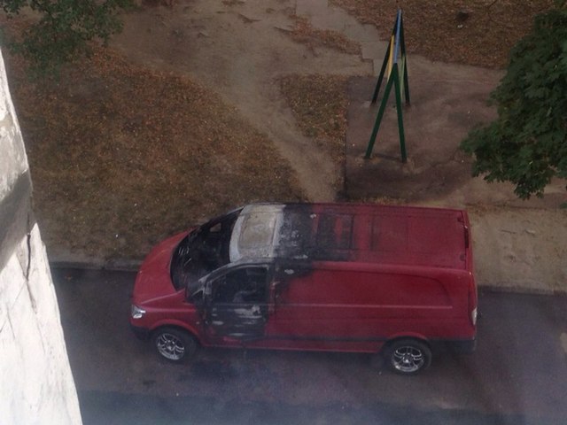 Сегодня, 28 августа 2015 года по ул. Одинцова,9А произошло возгорание микроавтобуса марки Мерседес, который находился во дворе жилого многоэтажного дома, расположенного недалеко от супермаркета "Сильпо".