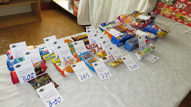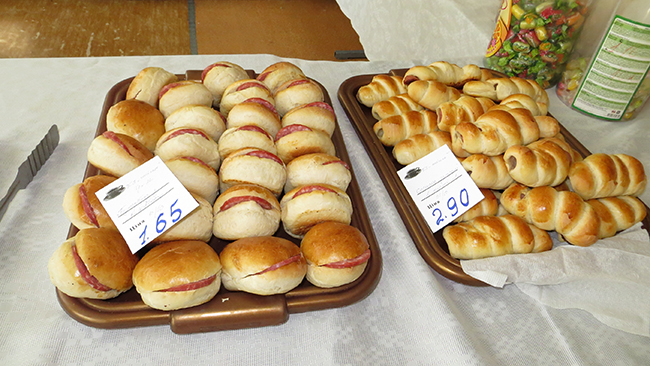 В школе работает и буфет. Здесь – те же бутерброды с колбасой и булочки с сосиской. Цена на продукцию производства школьной столовой, вполне приемлемая. Магазинные продукты – несколько дороже.