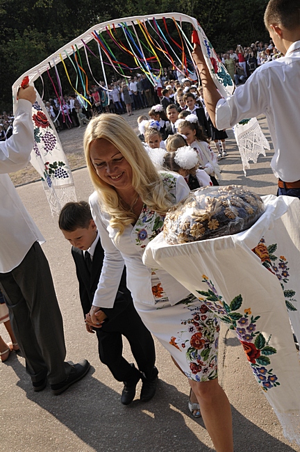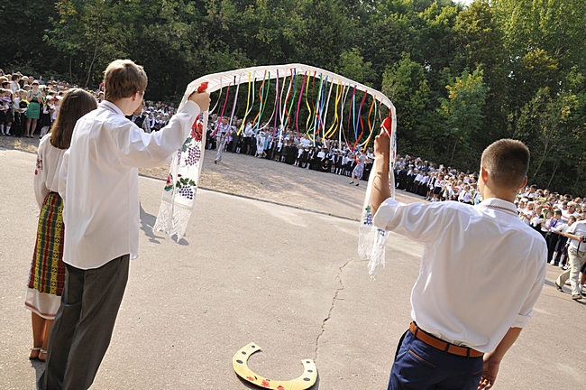 После первого звонка, который прозвучал впервые для первоклассников, ученики прошли в школу. На счастье, на удачу, старшеклассники подняли праздничную арку и положили подкову. Все первоклассники должны были наступить на подкову и пройти в арку.