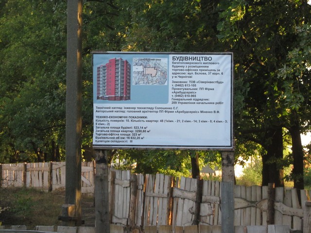 Возле огороженного несколько месяцев деревянным забором участка появилась табличка о том, что здесь планируют построить жилой дом. Правда, сроки сдачи дома пока не сообщают. Дом, судя по всему, собираются пристроить к уже существующему, так как он имеет аналогичный адрес, различие лишь в номере корпуса. О фирме-заказчике интернет выдает лишь ухвалу суда, цитируем: Як вбачається з матеріалів позовної заяви, позивач звернувся до суду з позовом, в якому просив визнати протиправною бездіяльність Чернігівської міської ради щодо зняття з розгляду та не прийняття рішення щодо поновлення дії договору оренди земельної ділянки № 3527 від 09.02.2009 року для ТОВ «СІВЕРІНВЕСТБУД», зобов'язати Чернігівську міську раду розглянути питання поновлення дії договору оренди земельної ділянки № 3527 від 09.02.2009 року для будівництва багатоповерхового житлового будинку з розташуванням магазинів та офісів на розі вулиць Родимцева та Мстиславської. Из которой следует, что строители имели претензии к горсовету, который не согласился продлить аренду на участок под постройку дома на углу улиц Родимцева и Мстиславской, а проектировщик значится в городе Ровно.