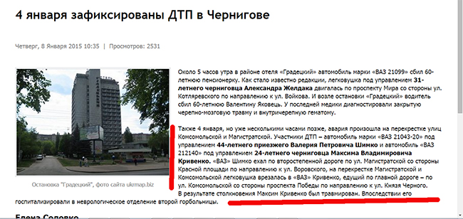 Когда журналисты прибыли к месту ДТП, водителя Hyundai уже увезла скорая помощь. По словам очевидцев, автомобиль пострадавшего двигался по улице Комсомольская, которая является главной дорогой и автомобиль, который двигается по ней, имеет преимущество. Перпендикулярно этому автомобилю, но по улице Магистратской, двигался другой Hyundai, за рулем которого была женщина. Что отвлекло водителя Hyundai, который двигался по Магистратской, почему автомобиль не остановился и не пропустил машину, ехавшую по главной – сказать сложно, поскольку по согласованию с ГАИ машина покинула место ДТП и мы просто не успели задать этот вопрос водителю.