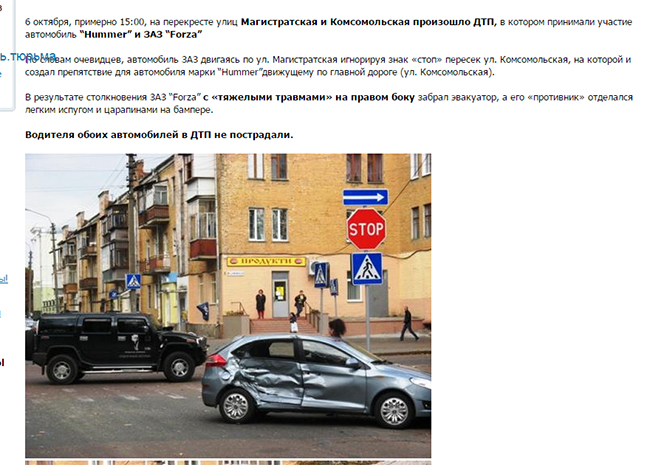 Сегодня, 4 сентября, на перекрестке улиц Магистратская и Комсомольская – очередное ДТП. Не смогли разъехаться два Hyundai. Есть пострадавшие. Учитывая то, что улица Комсомольская – главная, установить виновного в совершении ДТП и нарушении Правил – нет проблем. Но возникает вопрос: почему этот перекресток потенциально опасен и что городские власти сделали для решения этой проблемы?