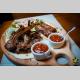 Четыре колбаски из баранины и овощи-гриль принесли на большой деревянной тарелке. Колбаски лежали на лаваше, присыпанные зеленью. Овощи-гриль — это помидоры, баклажаны, кабачки, перец и грибы. Вкусно.