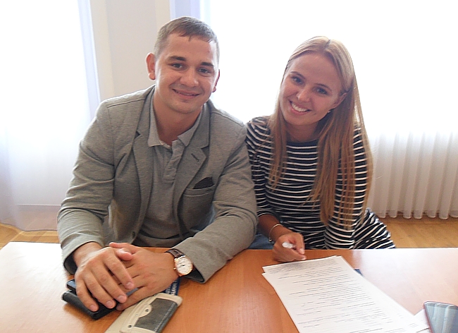 Подавать заявку на работу в полицию пришла и настоящая фотомодель - 21-летняя Алевтина Яременко. Поддержать девушку пришел и ее жених - 25-летний Юрий Левченко. Сперва девушка избегала общения со СМИ, смущалась, но нам удалось ее немного разговорить.