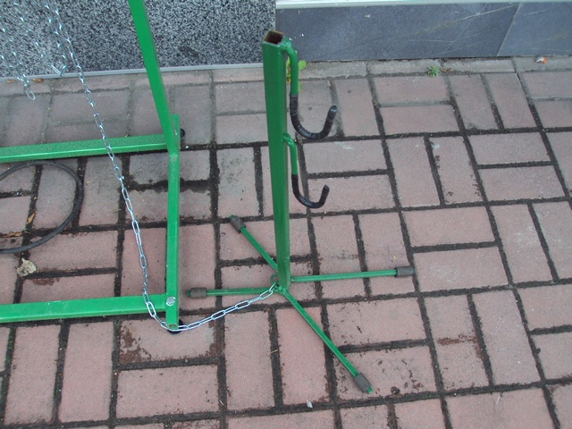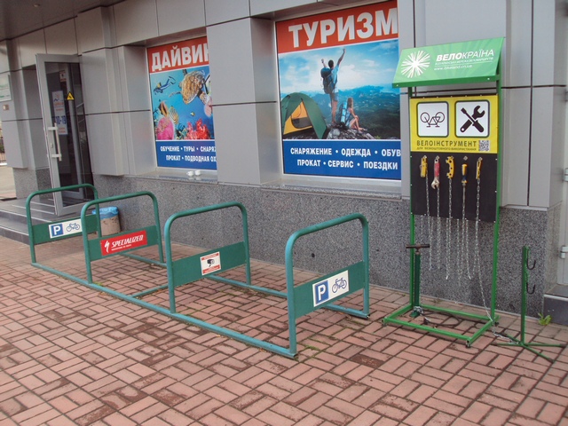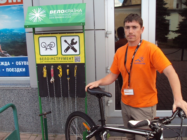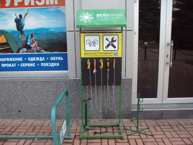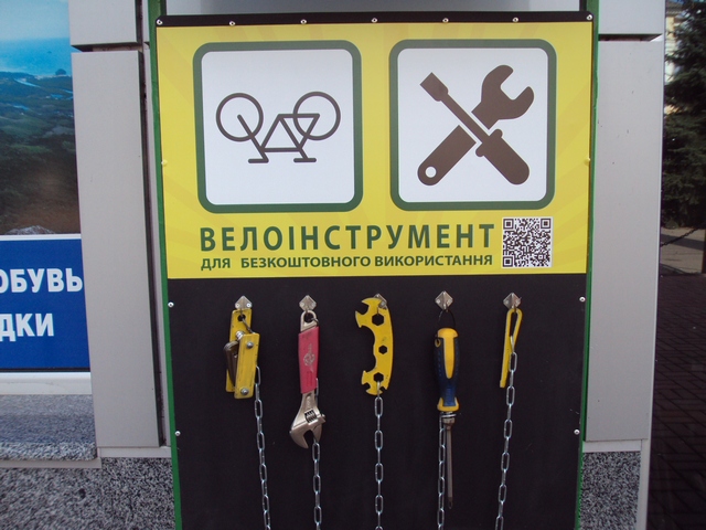 Для более удобного устранения технических неисправностей в велосипеде человек может установить его на специальную подставку. Всеми этими инструментами, насосом и самой подставкой люди могут пользоваться бесплатно. На стенде есть специальный QR код со ссылкой на статью на сайте bikeland.cn.ua в которой подробно описаны различные велосипедные инициативы.