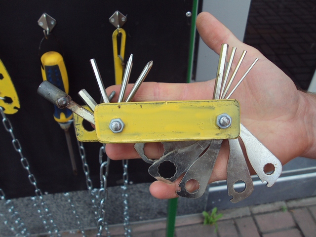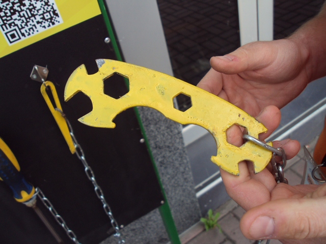 Подобные стенды уже давным-давно установлены за границей, поэтому и мы, в рамках развития велосипедной инфраструктуры города, решили дать старт подобной инициативе и тоже установили первый в городе стенд для велосипедистов. На этом стенде есть все инструменты, которые могут понадобиться велолюбителю, в случае возникновения тех или иных незначительных проблем с велосипедом. Начиная от спущенных колес и заканчивая неровностью колес.