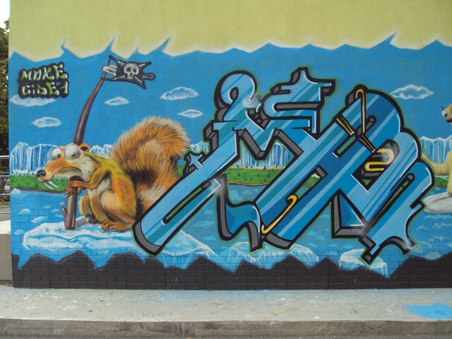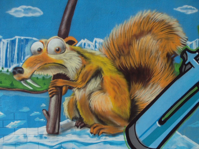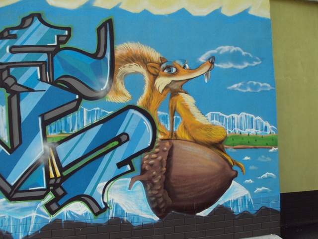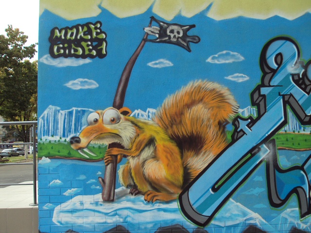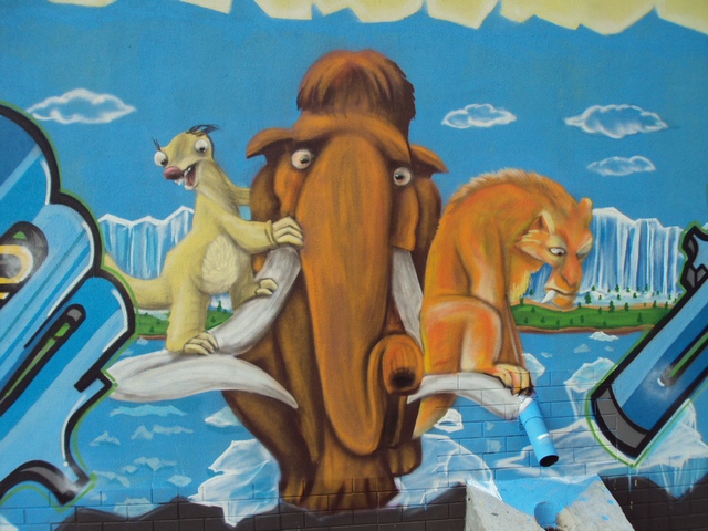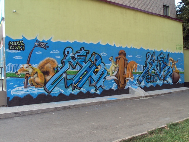 На боковой стене магазина по ул. Рокоссовского,14 появилось новое яркое граффити, на котором художники изобразили персонажей из известного и любимого многими мультфильма "Ледниковый период". Многие жители Чернигова, проходящие мимо этого творческого этюда, останавливаются на пару минут, чтобы как следует рассмотреть всех героев рисунка. Но больше всего этой настенной картиной восхищаются дети. Они не просто с изумлением смотрят на известных персонажей мультика, изображенных пестрыми красками, но и просят родителей сфотографировать их рядом с этим уличным произведением искусства.