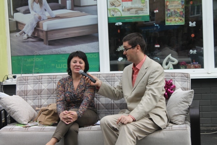 Приглашенная гостья из Славутича Лилия Шевченко поделилась своими впечатлениями за время пользования диваном, который она выиграла в прошлом году на дне открытия магазина: