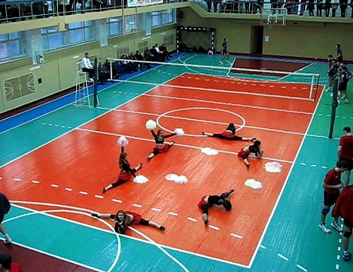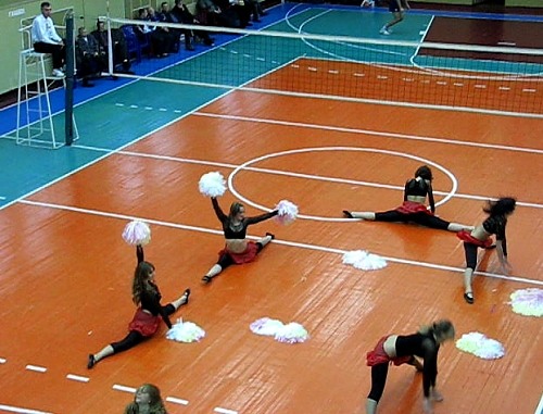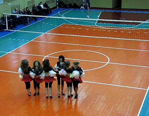 Выступление группы поддержки факультета физвоспитания ЧГПУ во время поединка 5-го тура волейбольного чемпионата Украины среди мужских команд Высшей лиги «Буревестник» (Чернигова) – «Новатор» (Хмельницкий)