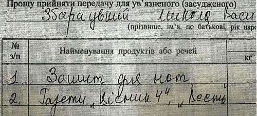 25 вересня ми віднесли у Чернігівський СІЗО для Миколи Васильовича передачу. А саме — зошит для нот, щоб час дарма не минув і талановитий композитор створив новий хіт. Чернігівець 61-річний Микола Збарацький — заслужений артист України, композитор, автор музики відомої пісні «Я козачка твоя». Віднесли також ручку і наші газети «Вісник Ч» та дружню «Віснику» «Весть» (коли читаєш, час спливає швидше). Якщо хочете, можете віднести передачу і ви: печиво, цукерки, чай, «Мівіну», цигарки тощо. Усе, що не в скляних банках, не б’ється і швидко не псується.