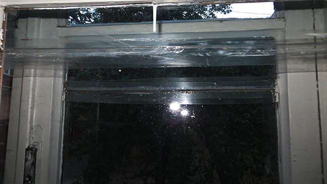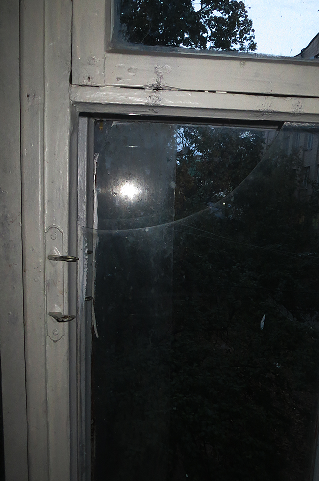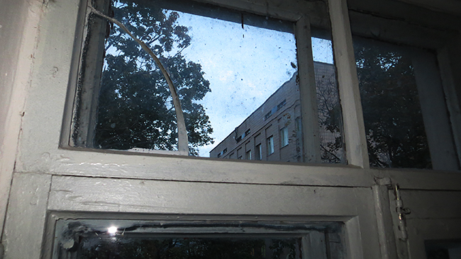 Жители подъезда рассказывают, что год назад действительно приходил «специалист» из КП «Новозаводское» для остекления одного из окон. Только вот пришел он с пустыми руками! На мусорке около дома ему удалось найти старое зеркало. Так вот этим зеркалом, предварительно ободрав амальгаму, и застеклили разбитое окно!
