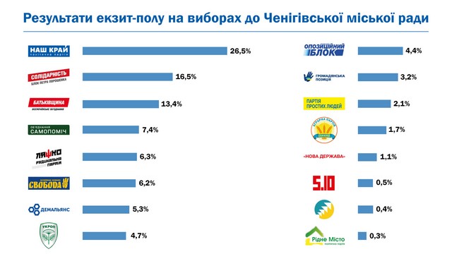 Зокрема, згідно з результатами екзит-полу у виборах до Чернігівської міської ради Чернігівська міська партійна організація політичної партії «НАШ КРАЙ» набирає 26,5 %. За нею йде Чернігівська міська організація партії «Блок Петра Порошенка «СОЛІДАРНІСТЬ», що набирає 16,5 %. На третьому місці – Чернігівська міська організація Всеукраїнського об’єднання «БАТЬКІВЩИНА» – 13,4 %. Також 5-відсотковий бар’єр долають такі партії: Чернігівська міська організація політичної партії «Об’єднання «САМОПОМІЧ» – 7,4 %, Чернігівська місцева організація Радикальної партії Олега Ляшка – 6,3 %, Чернігівська міська організація Всеукраїнського об’єднання «СВОБОДА» – 6,2 % та Чернігівська міська організація політичної партії ДЕМАЛЬЯНС (Демократичний Альянс) – 5,3 %.