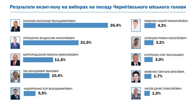 На виборах на посаду міського голови м. Чернігова впевнено лідирує кандидат від Чернігівської міської партійної організації політичної партії «НАШ КРАЙ» – Олександр Соколов із рейтингом 35,4 %. Наступний за рівнем підтримки кандидат від Чернігівської міської організації партії «Блок Петра Порошенка «СОЛІДАРНІСТЬ» Владислав Атрошенко – 21,6 %, за ним йде Микола Миргородський від Чернігівської міської організації Всеукраїнське об’єднання «БАТЬКІВЩИНА», за якого б віддали свій голос 11,5 %. І на четвертому місці – кандидат від Чернігівської міської організації політичної партії «Об’єднання «САМОПОМІЧ» – Володимир Зуб із рейтингом 10,4 %.