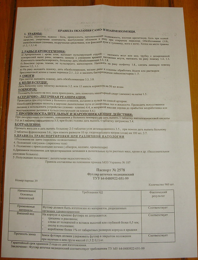 К аптечке прилагается перечень медицинских средств. Внимательно изучив ее, мы можем ссказать, что производитель аптечек бессовестно экономит на водителях. В нечестности его уличить нельзя: все указанные в списке компоненты были в наличии. Но при этом их качество оставляло желать лучшего.