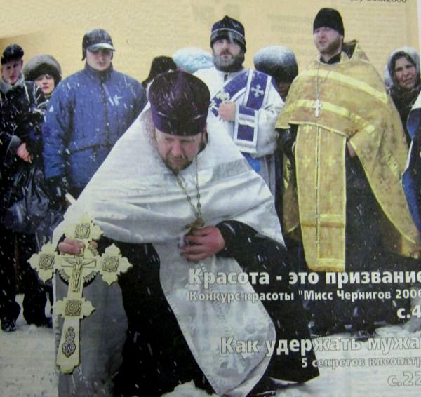 Несмотря на крещенские морозы, количество прихожан около Спасского собора не уменьшалось. В этот день все шли за свяченой водой, которую набирали из установленной перед собором купели, вода в которую спадала из установленного над ней Святого распятия. Ближе к полудню, недалеко от пешеходного моста на берегу Десны собрались казаки Черниговского казачьего полка под руководством генерала-хорунжего Михаила Товстыженко. Им была поручена почетная миссия - подготовка проруби для торжественного Богослужения и освящения деснянских вод. В назначенный час к этому месту подошел Крестный ход, в котором приняли участие жители города. После Великого освящения воды, христиане, сильные духом, несмотря на 20-градусный мороз и леденящий ветер, смогли троекратно окунуться в воды Десны, а сотни горожан - набрать освященной воды к себе домой. Вслед за ним последовали казаки Черниговского казачьего полка. В этот день воды всех водоемов мира набирают святости от вод Иордана, и несут в себе лечебные свойства. Вода, освященная в этот день, считается лечебной, ее хранят весь год, употребляют по утрам и принимают в случае болезни.