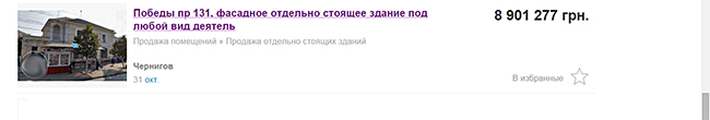 Кто-то хранит деньги в долларах, а кто-то «удачно» покупает недвижимость. Здание по проспекту Победы, 131 в Чернигове, судьбу которого активно обсуждали весной этого года, уже выставлено на продажу за 8,9 млн грн, хотя по имеющейся информации летом 2013 года Облсовет продал его вместе с земельным участком всего за 1,8 млн грн…