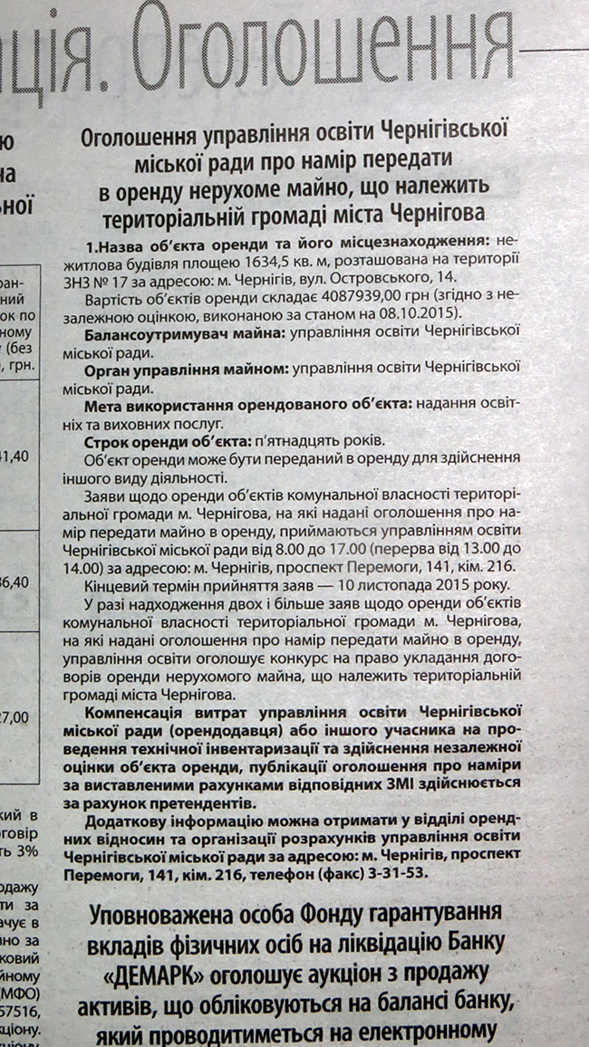 «Прочитайте объявление в последнем номере газеты "Черниговские ведомости" относительно аренды помещения по ул. Островского,14 сроком на 15 лет. Обратите внимание на оценочную стоимость. Не о 100 долл. за кв.м идет речь? – пишут сотрудники школы №17. – Помещение, которое Управление образования планирует до 10 ноября на 15 лет сдать в аренду, это бывший детский сад, а ныне корпус 17 школы! Спешат очень. Соседи с улицы Фабричной слышали от приезжавших смотреть здание, что они имеют ставки вокруг города, а теперь хотят частный детский сад сделать».