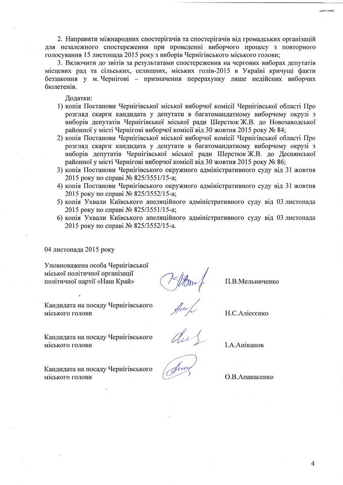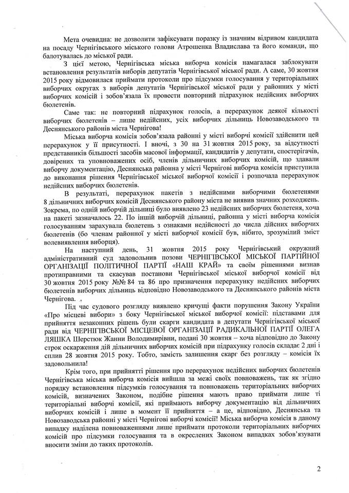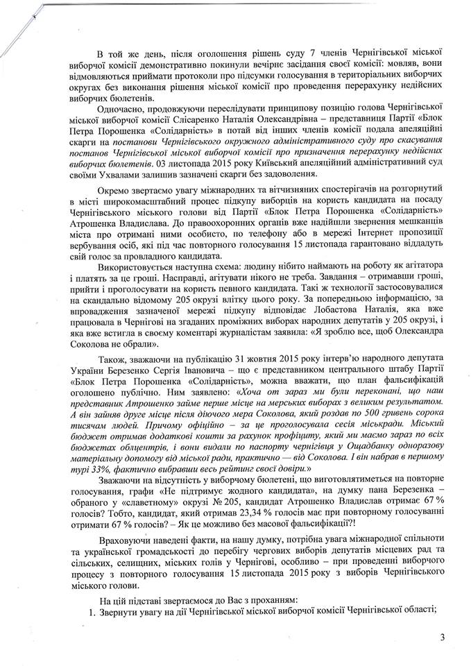 Вони просять звернути увагу на дії виборчої комісії, направити спостерігачів на другий тур виборів чернігівського міського голови та включити до звітів кричущі факти беззаконня.