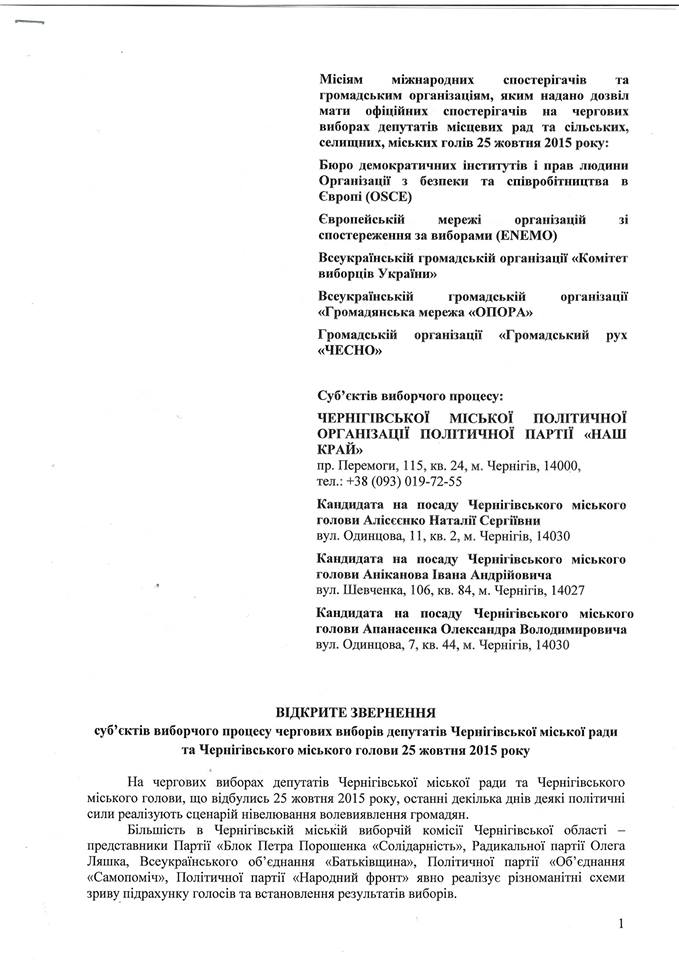 ПОЗИЦІЯ Через загрозу зриву виборів та підкупу виборців Чернігівська міська партійна організація політичної партії «Наш Край», кандидати на посаду мера Наталія Алісєєнко, Іван Аніканов, Олександр Апанасенко оприлюднили відкрите звернення до міжнародних та українських спостерігачів, громадських організацій.