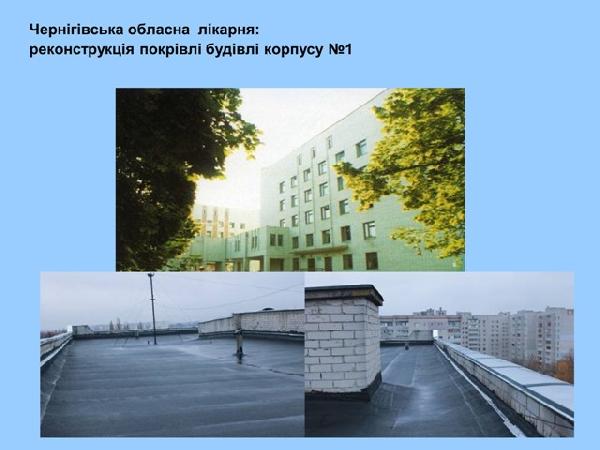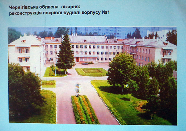 Черниговская областная больница: проведена реконструкция кровли палатного корпуса №1, для реконструкции здания в августе 2015 выделено 625 тыс грн. За счет этих денег проведена реконструкция кровли, заменены деревянные окна на металлопластиковые, в палате, где протекал потолок проведен ремонт (здание хирургического корпуса в больнице введена в эксплуатацию в 1966 году). Также в текущем году выделены средства из государственного фонда регионального развития в сумме 4,4 млн грн и из областного бюджета – почти 500 тыс грн для проведения реконструкции торакального отделения, которое будет введено в эксплуатацию в 2016 году.
