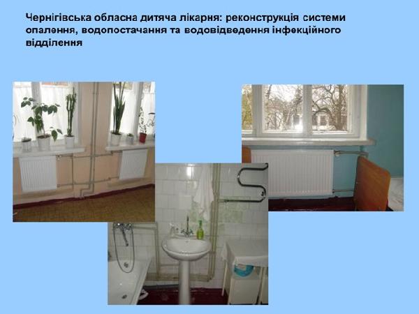 Так в Черниговской областной детской больнице была осуществлена реконструкция системы отопления, водоснабжения и водоотведения инфекционного отделения. А в сентябре 2015 начаты работы по замене технического оборудования, трубопроводов систем отопления, водоснабжения, водоотведения всей больницы. На сегодняшний день уже освоено 624 тыс грн.